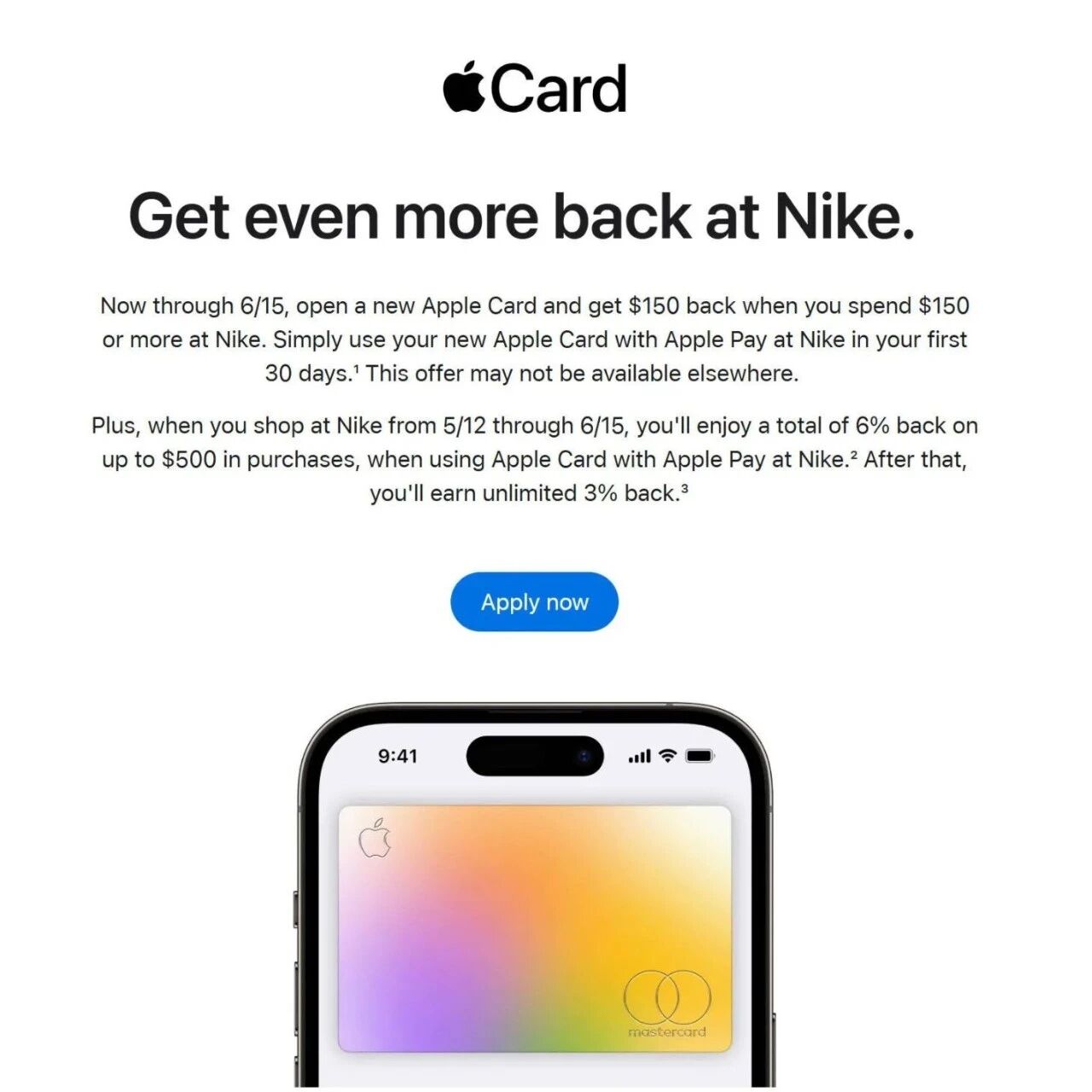 Apple Card x Nike 联名活动:送$150+6% 返现!