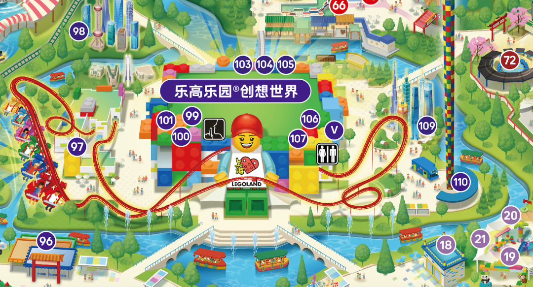 。江浙沪亲子遛小娃,上海乐高乐园还是很合适的。酒店还配套了乐园酒店,全都是乐高元素,感觉酒店就是一个小型乐高乐园。乐高乐园地图如下,中间的巨型乐高小人位置是乐高乐园创想世界。进园顺时针逛,依次是积木街道、乐高城市、乐高好朋友、乐高悟空小侠、乐高幻影忍者、乐高城堡和奇趣积木城。积木街道