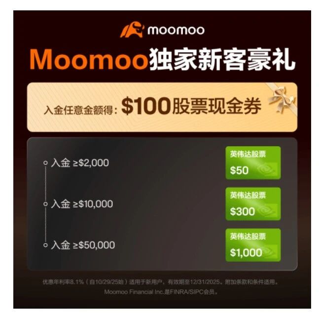 【新用户】入金得英伟达赠股+$100 股票现金券(含 5 张价值 20 美元的股票现金券,买股可抵扣)