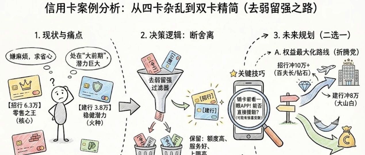 关于信用卡,我们说了很多的理论和信息,今天我们来分析一个实际的案例:某老铁有4张信用卡,招行6.3万、中行1万、建行3.8万、农行0.3万,现在是嫌来回摩擦比较麻烦,问保留哪两张比较好,省心省事?首先我们要判断目前该客户的实际需求,他是有资金的,不是靠信用卡生活,后续目标是不折腾。目前卡只有4行11.4万,属于信用卡大前期,典型的标志之一是只要用卡情况良好,还有较大提额空间。接着具体分析卡种和银行,按照用卡屋的数据分析,中行和农行相对来说提额比较小气,招行对额度最大方。当然是保留额度较大的招行和建行,销卡中行和农行。有个技巧是在销卡之前,可以去对应信用卡app看一下,是否现在就可以提额了,说不定有惊喜。如果4张卡目前均暂时无法提额,那么仍然先销卡中行和农行。留下的建行信用卡的3.8万,只要好好用一段时间,也有希望能提额到8万,这样就可以直接网申大山白,享受更多权益(大山白年费可以通过积分抵扣,而积分可以通过支付宝宝藏特权活动获得)招行卡已经达到了6.3万额度,在目前总授信比较低的情况下,之后额度会进一步提升那是不用怀疑的。突破了6万额度,多半是已经持有自由人生白金卡,每年需要通过消费达标豁免年费,这点要注意,避免被银行反撸,赚了年费。后期额度升到10万,可以尝试申请百夫长或者钻石卡,虽然有3600年费,但每年可以用积分兑换亚万里程或者万豪酒店积分,足以回本。今天第二个要提醒大家的是,不要乱帮人签字担保,比如下面图片说的就是这种事情一旦签字,你就要承担连带责任,并且征信上有这笔担保贷款,效果等同于你借了这笔钱,负债同步上升,直接影响你申请信用卡和其他贷款。还有一位朋友也是曝出了自己的血泪教训,让大家引以为戒:我做过这事,现在被银行列为老赖!