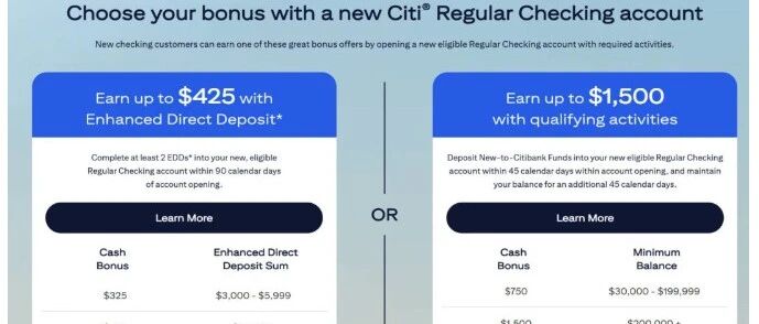 【2025.7 更新】Citi 更新了一波开户奖励,现在 Checking 靠存钱最高送 $1500,或者靠 Direct Deposit 可以获取 $425。大家可以根据自己的存款来选择。不过他家 DD 非常简单,可以考虑弄一下。