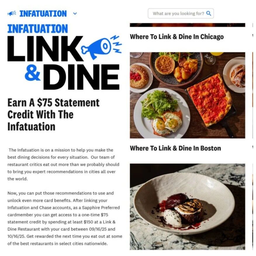 【2025.9 更新】现在 Sapphire Preferred 和 Infatuation 网站合作,链接账户后,在上面的餐馆列表中消费 $150,可以获取 $75 的 Statement Credit。注意,消费时间 9 月 16 日-10 月 16 日之间。