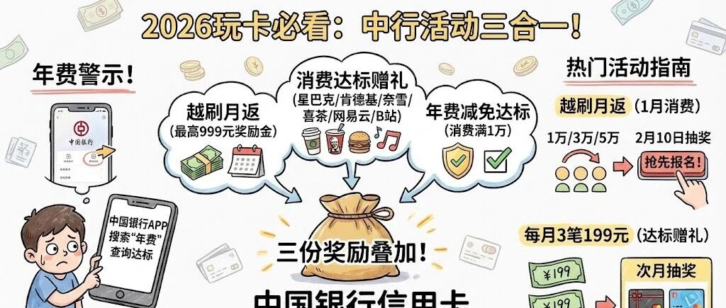 各位老铁可以打开中国银行app,搜索"年费",查询自己中行信用卡的年费达标情况比如我的中行卡就已经显示为需要消费笔数和消费金额同时达标才可以,所以目前持有中行卡需要特别留意年费问题,尤其是持有多张中行白金卡的老铁,老屋强烈建议尽量减持张数,否则只要有其中一张卡未能达到年费减免要求,就很可能会被扣取800元年费,亏血本。目前中行值得参加的活动,除了之前介绍过的 支付超给"利"活动,2026年信用卡玩卡人必看,领大银行1888元现金,