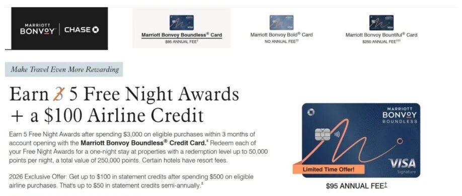【2026.1 更新】现在 Chase Marriott 的开卡奖励是 5 个 50k Free Night,理论上也有 250k 积分了。如果你有地方能用上 50k FN,这个 offer 还挺不错的。而且还额外有 $100 航空报销,半年一次 $50 。需要在航空消费 $250 才能激活。新增的福利还是不错的,估计常用的 UA travel bank 消费也是能激活的。特别注意,新用户申请自带这个 offer,老用户需要在下面的链接激活一次即可,下半年无需再次激活。