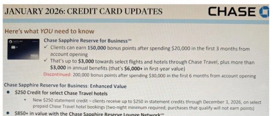 Chase Sapphire Reserve Business卡限时开卡奖200k积分,1月22日截止。2026年起年度$500酒店报销更灵活,叠加消费返现,价值显著。符合资格者抓紧申请。