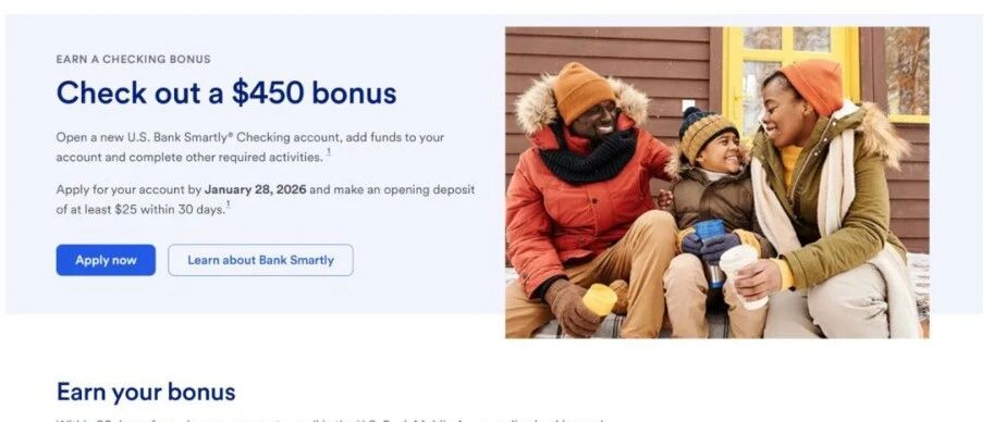 本文介绍US Bank Checking账户$450开户奖励,活动截至2026年1月28日,之后奖励将降至$400。重点说明如何通过简单转账满足Direct Deposit要求,并提供合作银行与平台列表,同时提及该账户对申请US Bank信用卡有帮助。