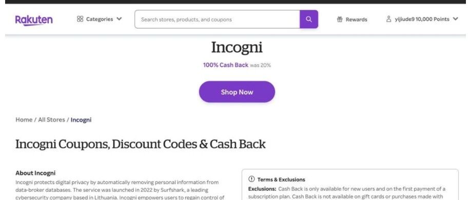 Rakuten返利活动:Incogni服务全返现,赚取高额积分